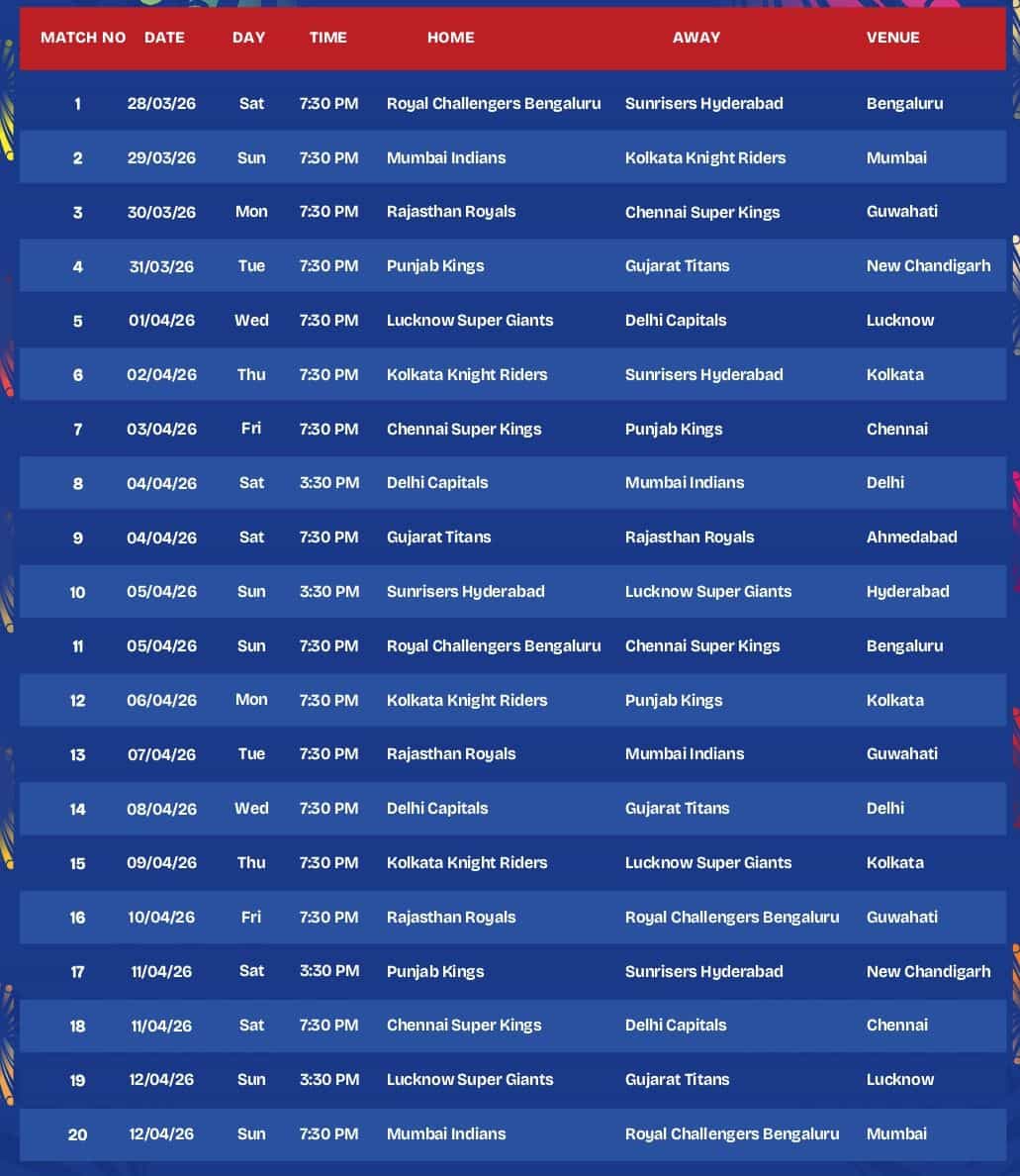 The first double-header of the season is scheduled for April 4, 2026, featuring a clash between the Delhi Capitals and the Mumbai Indians in the afternoon at the Arun Jaitley Stadium in Delhi, followed by the Gujarat Titans battling the Rajasthan Royals at the Narendra Modi Stadium in Ahmedabad. Additionally, the Rajasthan Royals will kick off their home campaign in Guwahati, where they will host both the Chennai Super Kings and the Mumbai Indians. Meanwhile, the Punjab Kings (PBKS) will be playing their early home matches at the PCA Stadium in New Chandigarh, setting the stage for a competitive and entertaining season ahead.