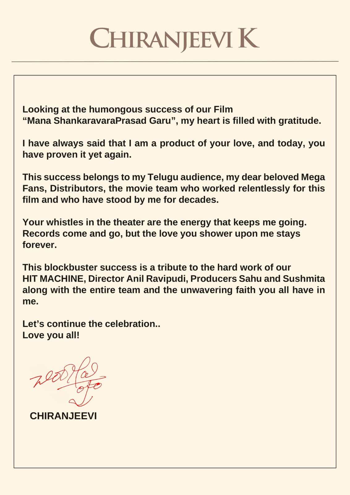 As the film is making waves at the box office and fueling the festive season, Chiranjeevi decided to talk about the power behind the success, not just the box office, but the fans, distributors and hard-working team. In his heartfelt note, he spoke in depth about the journey that brought “Mana Shankara Vara Prasad Garu” to this moment. He also reiterated that every milestone in his career has been shaped by the affection of generations of film lovers. This message resonates widely among his fans, who are celebrating his great legacy as well.