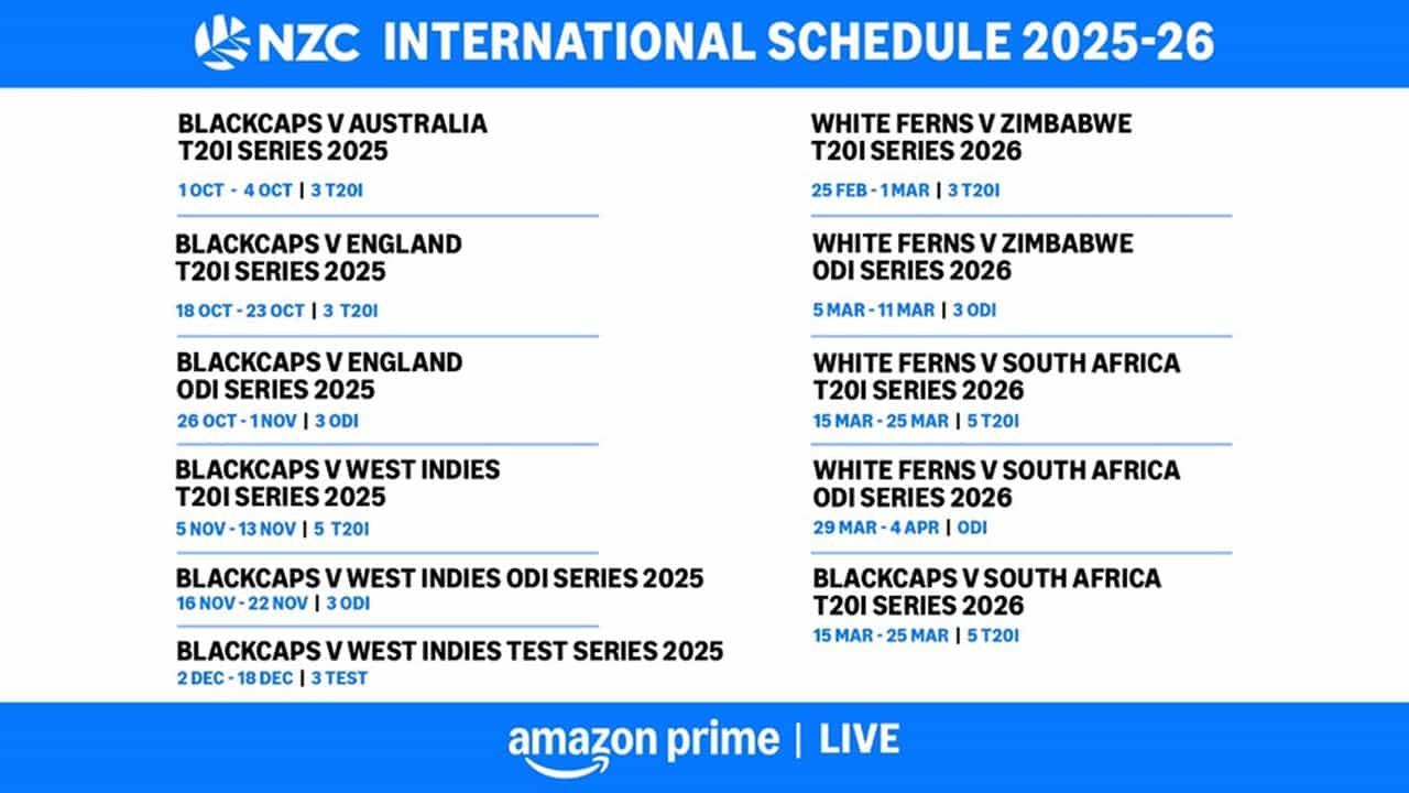 The schedule includes action-packed test matches, ODIs, and T20Is as New Zealand face off against Australia, England, West Indies, Zimbabwe, and South Africa between October 2025 and March 2026