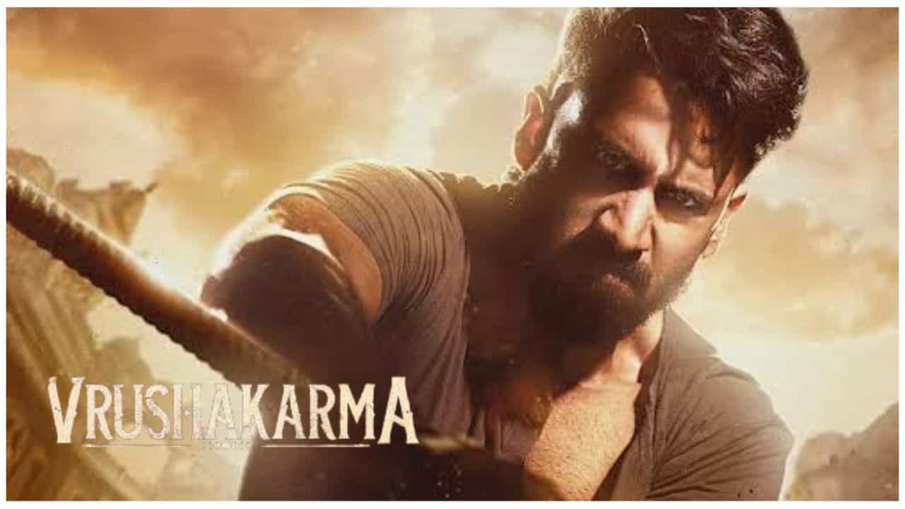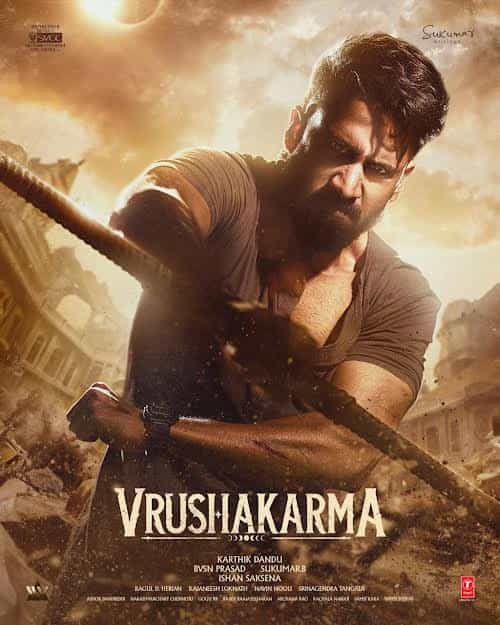 The first look poster of VRUSHAKARMA presents a raw, intense, and power-packed visual that instantly sets the tone for this never-before mythical thriller. Dominated by earthy tones, dust, the poster captures a high-impact moment filled with grit and urgency.