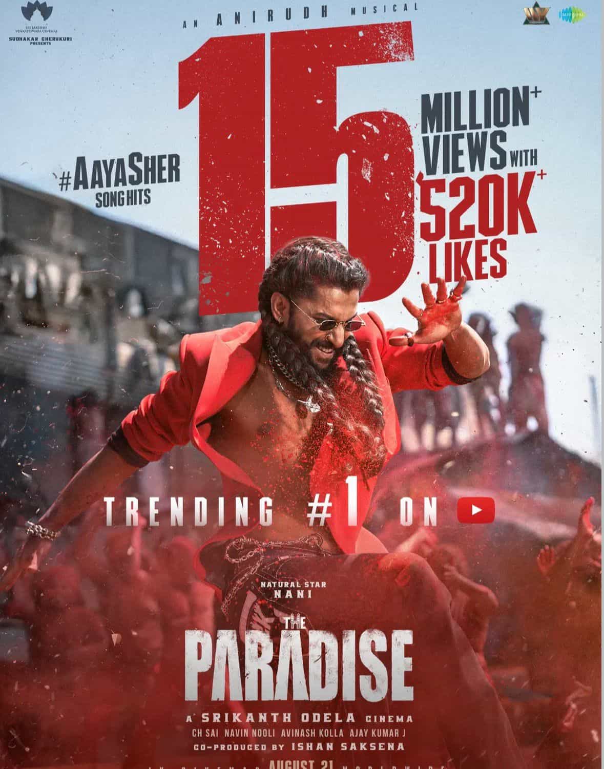 The first track, “Aaya Sher,” from the highly anticipated Pan Indian film ‘The Paradise,’ directed by Srikanth Odela and featuring Telugu superstar Nani in the lead role, is creating quite a buzz on social media. Released just recently to coincide with Nani’s birthday, the song has already amassed over 15 million views on YouTube within a mere 24 hours, quickly climbing the trending charts. Fans are eagerly awaiting the film’s global release on August 21, 2026. This project marks the reunion of Nani and director Srikanth Odela, who previously collaborated on the blockbuster ‘Dussehra.’ Produced by Sudhakar Cherukuri under the Sreelakshmi Venkateswara Cinemas banner, ‘The Paradise’ is poised to be a significant milestone in Nani’s career.