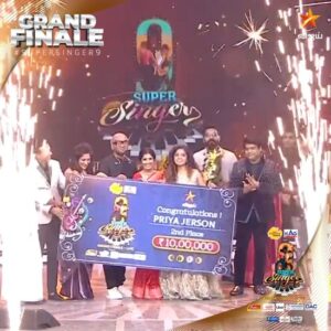 9th Season of Star Vijay TV’s Musical Reality Show Concluded by Crowning The Winner, Aruna Sivaya. Channel Telecast the Grand Finale on Sunday, 25th June at 03:00 PM, Harris Jayaraj Was the Chief Guest of The Finals. playback singers Anuradha Sriram, Unnikrishnan, Sweta Mohan, and Benny Dayal Judges The Final Performance of The Contestants. Abhijith Anil Kumar ,Aruna Sivaya , Pooja Venkatraman , Prasanna Adhisesha and Priya Jerson Are the Contestants reached the Finals of Super Singer 9.