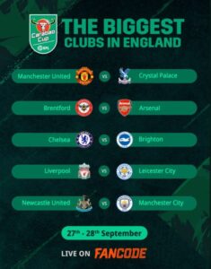 England’s top teams will be in action at the Carabao Cup, with Manchester United, Arsenal, Chelsea, Newcastle, Manchester City and Liverpool amongst teams in action in this round of games. FanCode is the exclusive broadcast partner in India for the tournament.