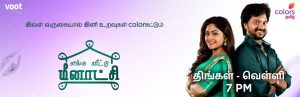 எங்க வீட்டு மீனாட்சி (Monday – Friday, 7 PM – 8 PM) – Meenakshi moves into Chidambaram’s house for a week even as her uncle Meiyappan’s family moves into her own home, eventually forcing her out. Will Meenakshi fall for Chidambaram or will she be trapped into an alliance with Meiyappan’s family? Don’t miss the action to learn how the story develops.