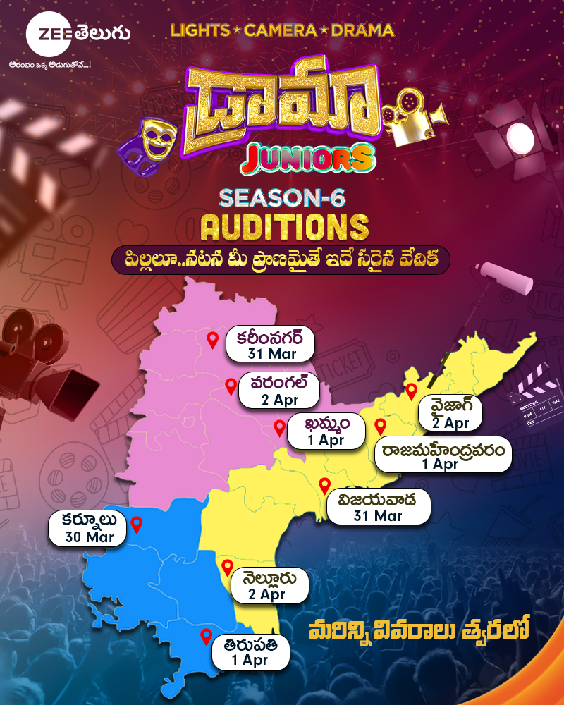 Drama Juniors is One of The Popular Reality Show on Zee Telugu Channel, They Announced the Season of The Same.Drama Juniors Season 6 (డ్రామా జూనియర్స్ సీజన్ 6) Auditions Conducting at Visakhapatnam, Nellore, Hanumakonda, Khammam, Tirupati ,Rajamahendravaram, Vijayawada, Karimnagar etc.