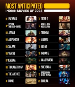 After a hiatus of four years, Bollywood will see the comeback its superstar Shah Rukh Khan in the lead role with three big releases – Pathaan, Jawan, and Dunki. SRK’s daughter Suhana Khan is also making her debut in 2023 with the Zoya Akhtar movie The Archies, which has made it to #9 on the list.