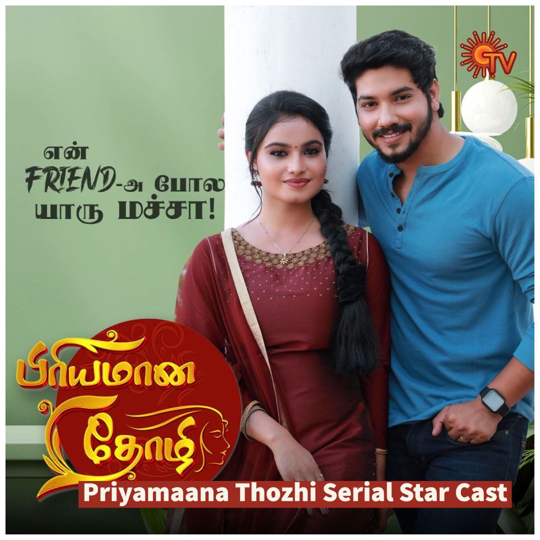 Sandra Babu is the Heroine of Serial Priyamana Thozhi , She is Currently Working With Asianet Serial Thoovalsparsham as Malavika. Vicky Roshan , Metti Oli Vanaja and Many Popular Mini Screen Actors Working with the Serial, Aravindh , Sangavi are Some of the Characters of the Show. Sun Entertainment and VSAGA Pictures Private Limited Are Producing the Show, Sun NXT Application Will Stream Online Videos of This Sun TV Serial.