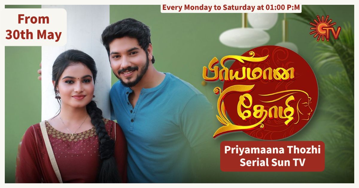 Sun TV launching it’s latest Tamil Serial Titled Priyamaana Thozhi from 30th May, Every Monday to Saturday at 01:00 PM is the Telecast Time. Popular Malayalam Serial Actress Sandra Babu Doing the Heroine role in the Show. Priyamana Thozhi Female Lead Character Name is Pavithra, Channel Added Promos of the Show Under the Tagline Conditions of Pavithra is Very Tough (பவித்ராவோட Conditions பயங்கரமா இருக்கே! ). Vicky Roshan as Aadhi is the Hero, Metti Oli Vanaja Playing the Role of Seetha (Hero’s Sister). Chithi 2 Finished On Sun TV and New Serial Priyamaana Thozhi Telecast at Afternoon Slot.
