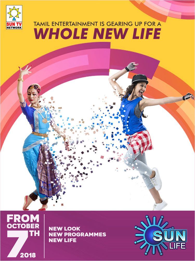 Sun network rebranding sun life channel as the second tamil general entertainment channel for sun tv. Sunlife channel will get a new look and style from 7th october 2018. Logo will change and sun group planning more fresh programs on the channel. They have already updated the official facebook page with new logo, yellow colors changed into blue. Promos for the rebranding airing through different sun channels and facebook pages. Swapna Sundhari, Masala Café ar some of the new shows coming on the channel. This channel is already available through all leading cable. direct to home services.