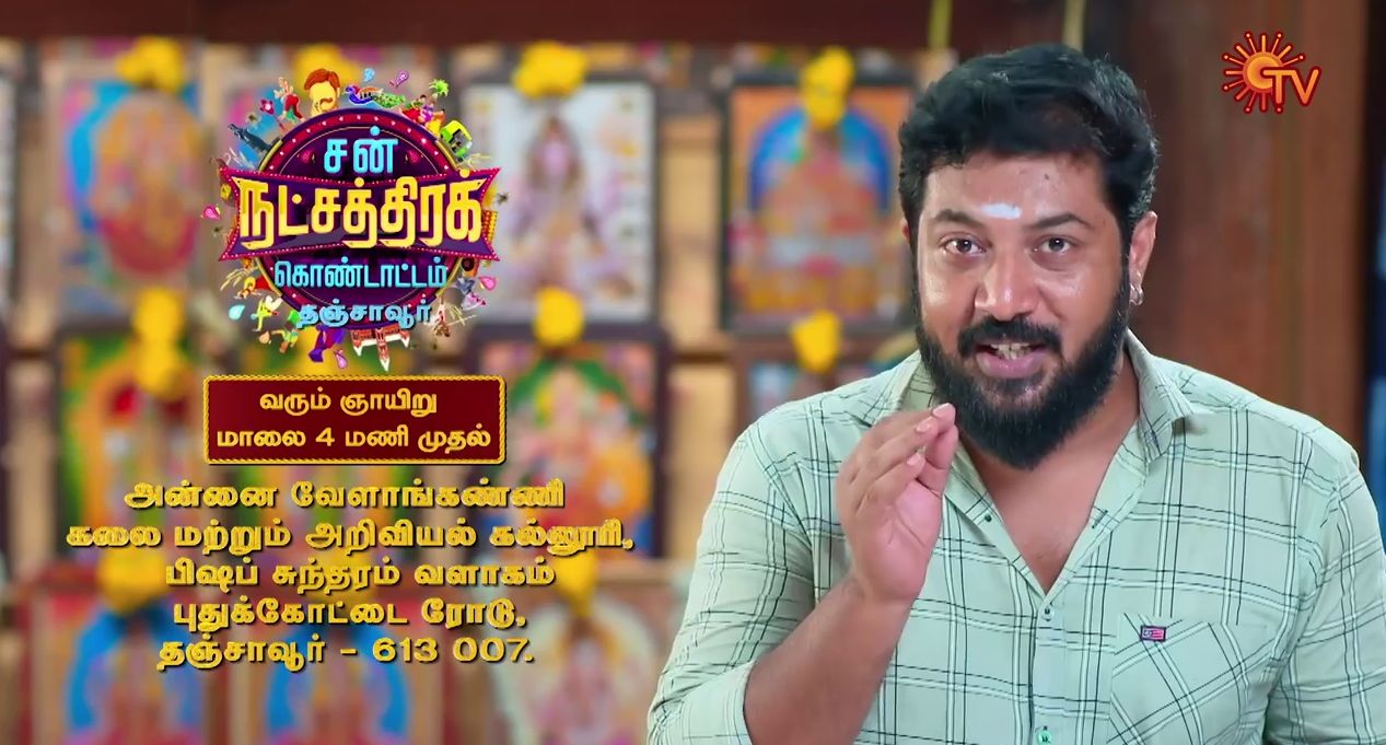 Annai Velankanni College of Arts and Science, Bishop Sundaram Campus, Pudukottai Road, Thanjavur- 613007 is the Venue for Sun Natchathira Kondattam Thanjavur. Sunday 28th August at 04:00 PM is the Date and Time for The Event. Sun TV Conducting Sun Natchathira Kondattam Events Various Places of Tamil Nadu. The event Recently Happened at Cuddalore and Sun TV Coming to Entertain People of Thanjavur.