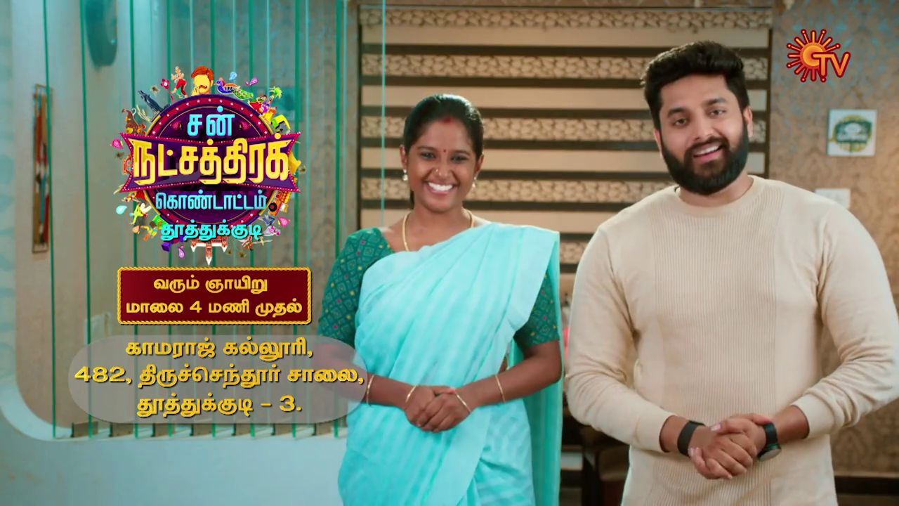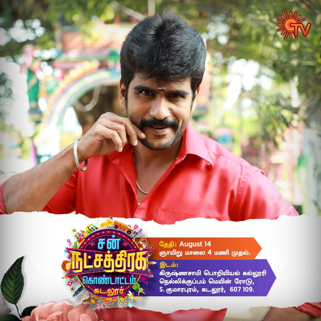 Various celebrities from Sun TV channel come together and entertain the audience with songs, dances and comedy skits tec Through The Natchathira Kondattam Event. Raghav , Divya Shridhar Starer Sevanthiis the latest Serial Started by Sun TV. Artists from Magarasi , Thirumagal , Sevanthi , Priyamana Thozhi , Pandavar Illam , Chandralekha , Aruvi , Thalattu , Abhiyum Naanum , Sundari , Kayal , Vaanathai Pola , Kannana Kanne , Roja , Ethirneechal , Anbe Vaa will Appear in Sun Natchathira Kondattam Thoothukudi Event.