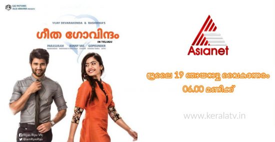 Geetha Govindam Malayalam Dubb premiers 19th July Sunday at 6:00 P.m on Asianet Starring Vijay Devarakonda, Rashmika Mandanna, Subbaraju, Nithya Menon etc in Lead (Update – Channel cancelled this). Arjun Reddy premier scored decent trp ratings and Asianet planning to premier more telugu films soon.